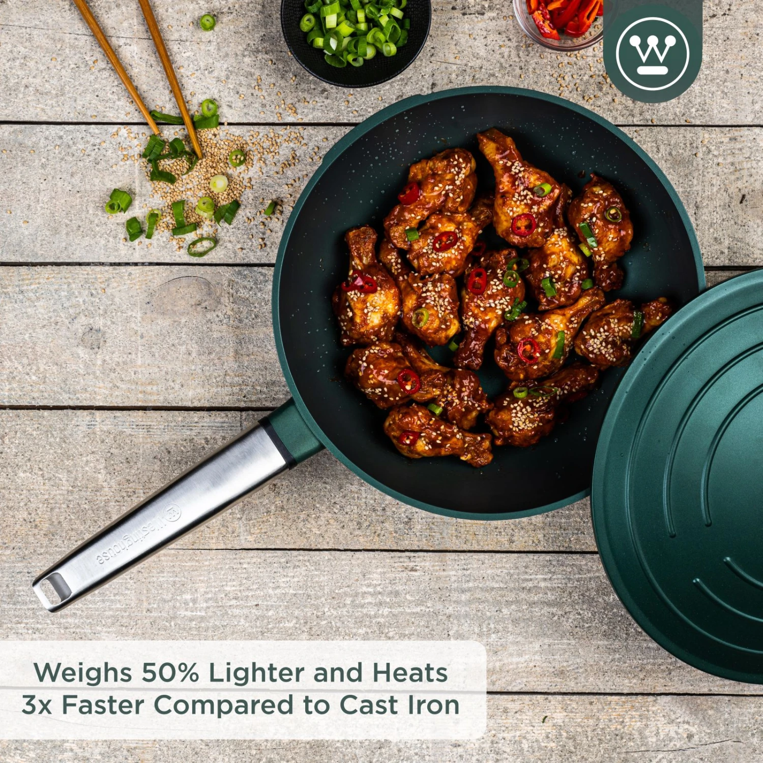 De Westinghouse Performance pannen zijn gemaakt van gegoten aluminium, waardoor ze veel lichter zijn dan de pannen van gietijzer. Hierdoor worden deze pannen drie keer zo snel warm als gietijzeren pannen en zijn ze veel makkelijker te verplaatsen van kast naar fornuis. Daarnaast zijn de pannen geschikt voor alle fornuizen en ovens!